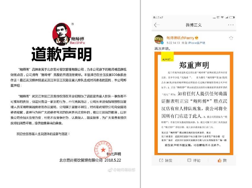 5月22日中午12:20分,一家微博名為“鮑師傅總部”,署名為北京易尚餐飲管理有限公司的微博賬號發(fā)出道歉聲明,表示公司對雇人排隊一事負有不可推卸的責(zé)任,但同時聲明:只是這一家店的行為,不代表其他店。