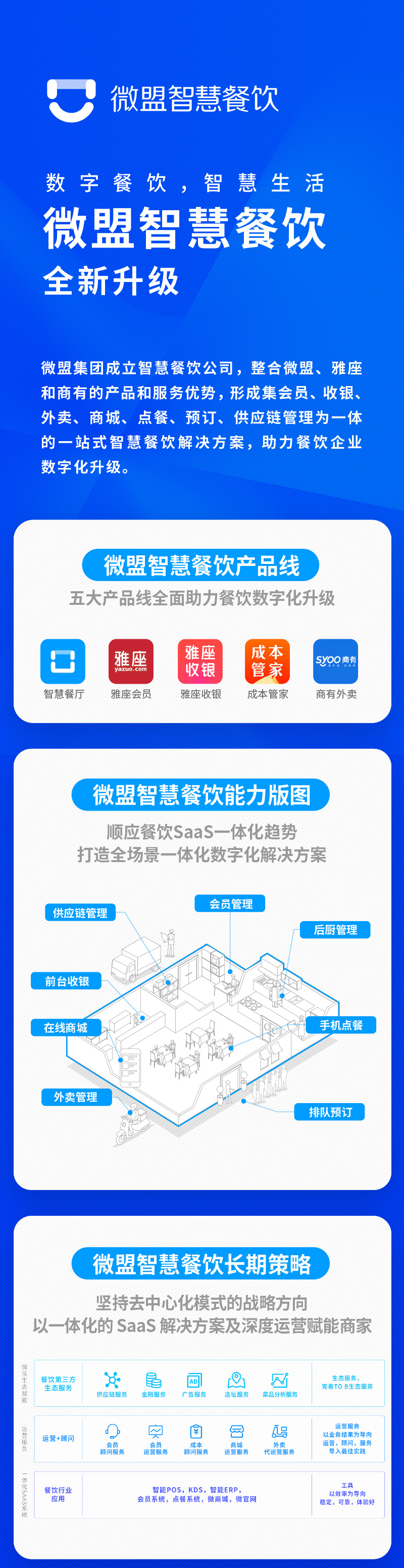 智慧餐飲是微盟智慧商業(yè)生態(tài)布局中的極為重要的一塊拼圖,也是微盟SaaS業(yè)務(wù)接下來(lái)重點(diǎn)發(fā)力的方向之一。此次微盟成立智慧餐飲公司,通過(guò)將微盟原有的智慧餐飲解決方案與雅座、商有的多方資源進(jìn)行全盤整合,重新調(diào)整管理構(gòu)架和細(xì)分五大產(chǎn)品體系,形成一站式全場(chǎng)景數(shù)字化解決方案,將進(jìn)一步提升微盟智慧餐飲的綜合實(shí)力和行業(yè)競(jìng)爭(zhēng)力,業(yè)務(wù)發(fā)展有望提速。據(jù)悉,微盟智慧餐飲的愿景是“數(shù)字餐飲”?!爸腔凵睢?,以領(lǐng)先的數(shù)字技術(shù)和專業(yè)的顧問(wèn)服務(wù),助力餐飲企業(yè)向數(shù)字化轉(zhuǎn)型升級(jí)為使命。新調(diào)整后的微盟智慧餐飲五大業(yè)務(wù)線將全面覆蓋頭部、腰部及中長(zhǎng)尾餐飲商戶需求,全方位助力餐飲商戶數(shù)字化升級(jí)。