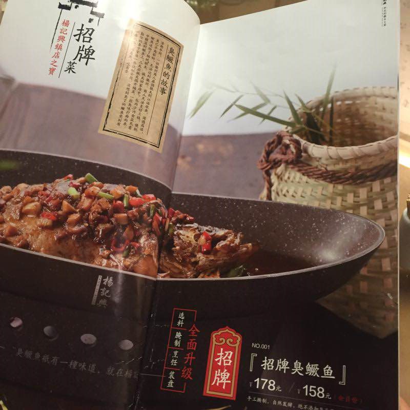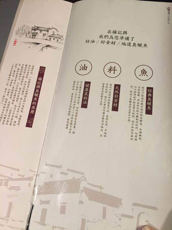 翻開第一頁就是:在楊記興,我們?yōu)槟銣蕚淞撕糜?,好食材,地道臭鱖魚。