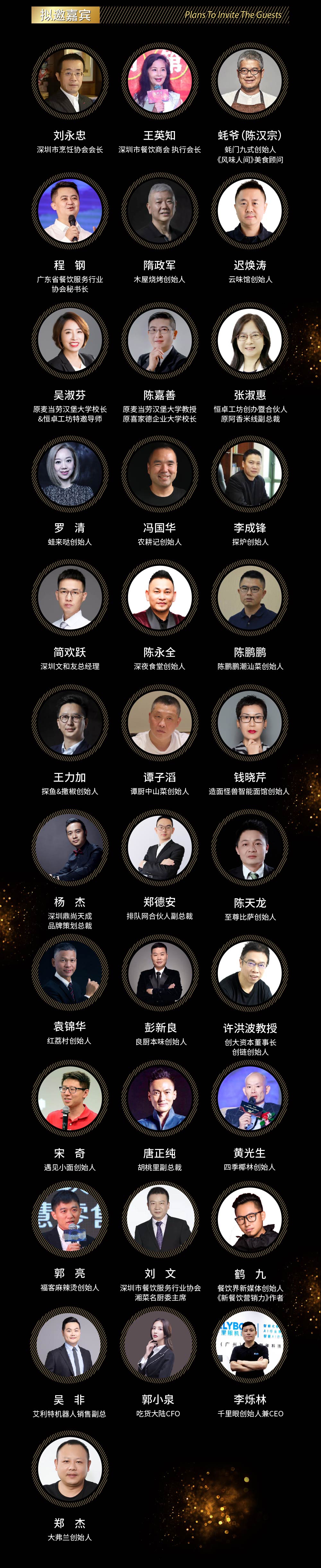 大會邀請了西貝、面點王、蛙來噠、大目牛肉火鍋、八合里、木屋燒烤、費大廚、大弗蘭、辣可可、??吐槔睜C、深圳文和友、永和快餐、云味館、譚廚、皖廚、紅荔村、造面怪獸智能面館、蠔門九式、胡桃里、探爐、順德公、四季椰林、遇見小面、大龍燚、戲鳳記、茶大椰、茶天娜、我很芒、有茶、奈雪的茶、至尊比薩、阿香米線、俏九州、農耕記、良廚本味、上海老棧、樂凱撒比薩、24漂流茶、酸囧酸菜魚、五稻廚房、任一碗、潮逸軒創(chuàng)始人、潮江春、尚廚餐飲、魚非魚、魚與漁、客家王子、摩打食堂、深夜食堂、馬來一號等超100個餐飲定向邀請品牌