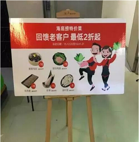 在無(wú)錫海底撈餐廳,正在以“回饋老客戶最低2折起”的名義,于2015年12月22日到2016年2月21日期間,推出一系列特價(jià)菜。據(jù)網(wǎng)友曝出的菜價(jià)單,涉及這場(chǎng)促銷的菜品,主要有脆脆毛肚、蝦滑、鴨腸、烏雞卷等幾種,但價(jià)格卻異常低廉,僅標(biāo)價(jià)8元到15元不等。