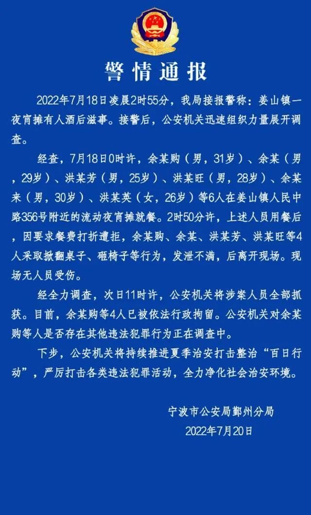 7月20日,寧波市公安局鄞州分局通報“多名男子打砸燒烤攤”事件,表示公安機關(guān)已將涉案人員全部抓獲。目前,余某購等涉案人員4人已被依法行政拘留。