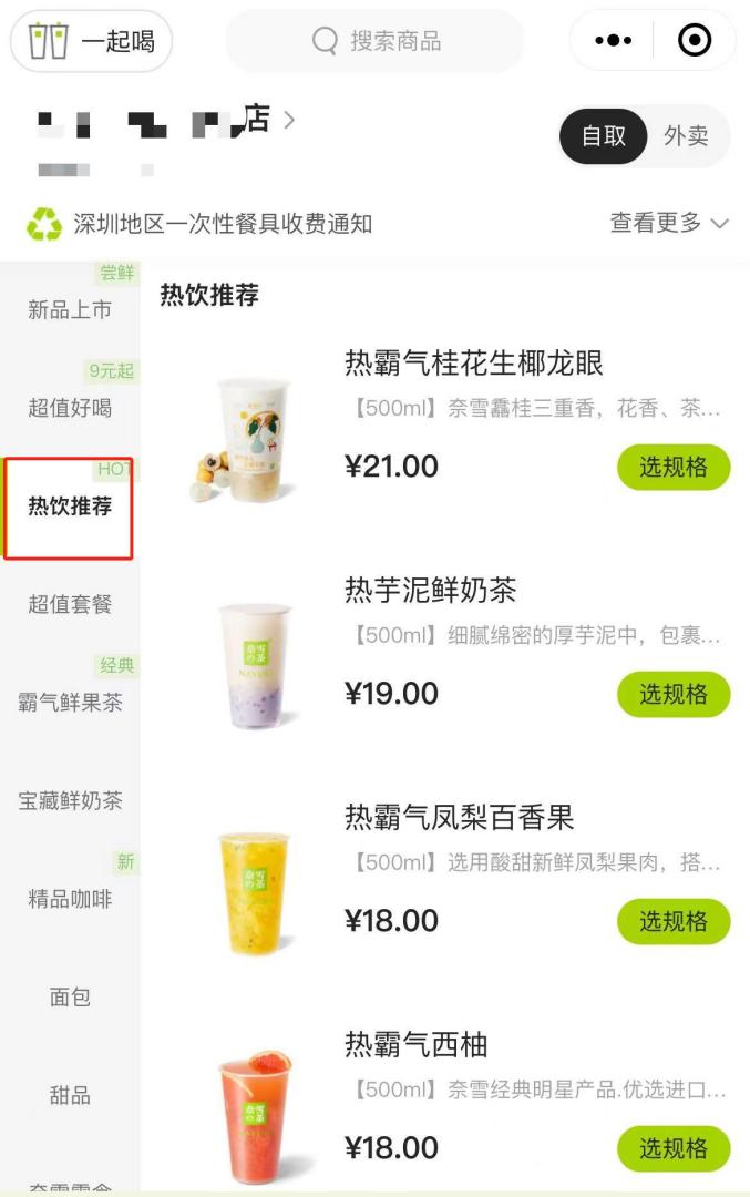 圖:奈雪點單小程序“熱飲推薦”