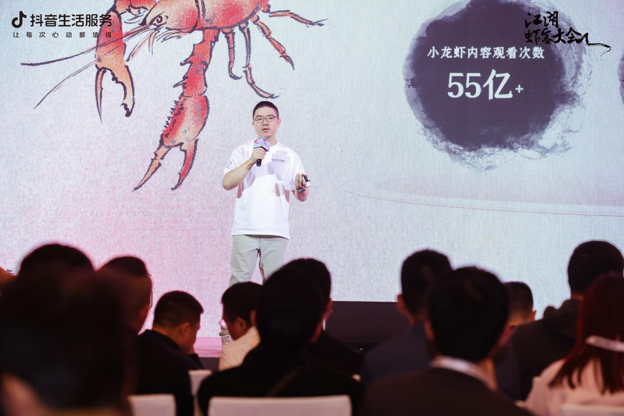 作為特色菜與地方菜的重要菜品,小龍蝦引發(fā)全民追捧,龍蝦季成為狂歡盛宴。抖音生活服務(wù)餐飲行業(yè)南區(qū)市場(chǎng)策劃總監(jiān)王杰夫通過多維數(shù)據(jù),展示小龍蝦的火爆程度。近一年來,抖音上小龍蝦相關(guān)內(nèi)容視頻量超90萬(wàn),觀看次數(shù)已超過55億,小龍蝦內(nèi)容創(chuàng)作者超27萬(wàn),小龍蝦內(nèi)容互動(dòng)量超8900萬(wàn)。