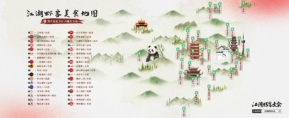 基于巨量引擎城市研究院的用戶喜愛POI興趣打卡地,在峰會(huì)現(xiàn)場(chǎng),抖音生活服務(wù)針對(duì)小龍蝦品類重磅發(fā)布了江湖蝦客美食地圖,囊括了各地的小龍蝦推薦品牌,一張圖帶領(lǐng)蝦客打卡全國(guó)。