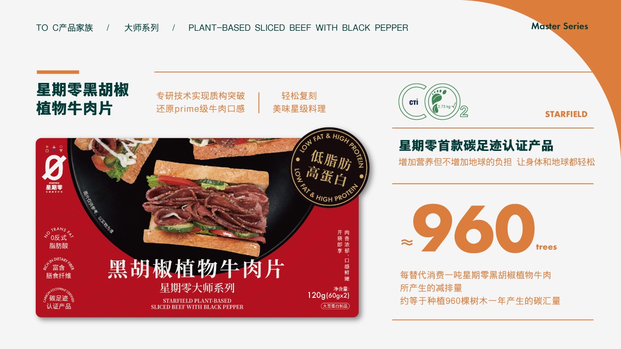 值得注意的是,目前「星期零」已進(jìn)入整肉塑性階段,可創(chuàng)造出具有整塊肉紋理的產(chǎn)品,通過間斷式針織風(fēng)味和精進(jìn)酶法交聯(lián)技術(shù),達(dá)到模擬肌纖維的效果,形成色、香、味與真肉媲美的植物肉,為國人提供健康和美味兩全的飲食體驗(yàn)。該技術(shù)的代表產(chǎn)品“黑胡椒植物牛肉片”不僅可以開袋即食,還可通過輕烹搭配主食享用,滿足更多元的植物蛋白餐食需求。在不犧牲風(fēng)味口感的基礎(chǔ)上,產(chǎn)品通過添加植物性配料,解決了大部分傳統(tǒng)腌制肉類產(chǎn)品添加“防腐劑”“亞硝酸鹽”的固有缺點(diǎn),并具有0反式脂肪酸、低脂高蛋白等優(yōu)勢(shì),憑借出色的體驗(yàn)獲得市場好評(píng)。同時(shí)這款產(chǎn)品,經(jīng)過華測碳足跡認(rèn)證,對(duì)比同類動(dòng)物肉產(chǎn)品碳排放約減少84%。