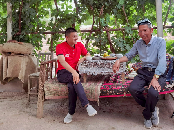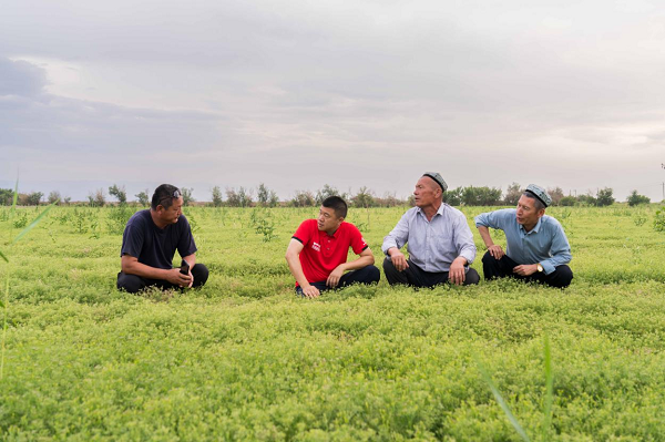 在與當?shù)剞r(nóng)戶親切交流之后,管氏翅吧創(chuàng)始人管其兵深入田埂,在一株株孜然植株間考察當季孜然的產(chǎn)新情況。5月底的孜然種子呈現(xiàn)嫩綠色,粒粒飽滿,散發(fā)著獨特的香氣。管其兵輕撫著孜然植株嫩綠色的葉片,并不斷詢問關(guān)于孜然生長情況的細節(jié)。“往年這時候已經(jīng)在收割了?!碑?shù)剞r(nóng)戶依力哈木大叔向他介紹到,“今年閏二月,孜然生長期延遲,長勢也更加喜人,估計今年是個好收成!”言語之間,依力哈木大叔臉上泛出淳樸而快樂的笑容。
