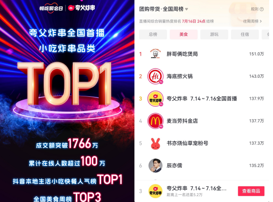 夸父炸串抖音全國首播成交額破1766萬:世界冠軍也愛吃 熱度行業(yè)第一!