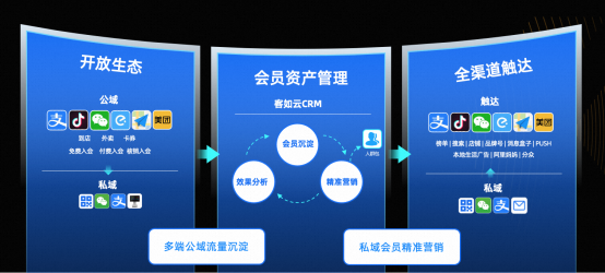 客如云在“公轉(zhuǎn)私”方面有豐富的經(jīng)驗,能夠通過小程序和CRM營銷系統(tǒng),幫商家將抖音等平臺吸引來的流量轉(zhuǎn)化為商家自有流量,從而更精準(zhǔn)的進行會員管理,形成一整套完整的拉新-引流-獲客-復(fù)購的數(shù)字化升級鏈路。
