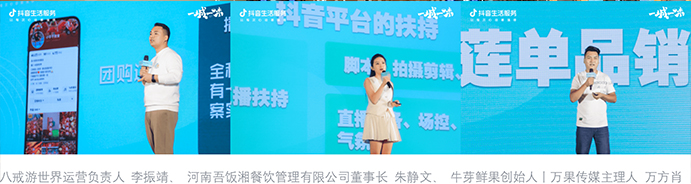 活動(dòng)現(xiàn)場(chǎng),三位品牌代表的干活分享和技能點(diǎn)拉滿收獲陣陣掌聲。作為商家,更需要具備的是了解達(dá)人市場(chǎng),找到好的達(dá)人,用好達(dá)人。八戒游世界運(yùn)營(yíng)負(fù)責(zé)人李振靖代表服務(wù)商現(xiàn)身說(shuō)法商家如何在抖音生活服務(wù)業(yè)務(wù)生態(tài)體系中,借力達(dá)人實(shí)現(xiàn)品效合一,提升GMV。河南吾飯湘餐飲管理有限公司董事長(zhǎng)朱靜文從打造個(gè)人IP,從內(nèi)容破圈,放大餐飲新能量。牛芽鮮果創(chuàng)始人丨萬(wàn)果傳媒主理人萬(wàn)方肖分享了一家鮮果店從0-1的抖音經(jīng)營(yíng)之旅,深挖線上陣地建設(shè)過(guò)程中的困難、經(jīng)驗(yàn)、思考,為更多同行提供實(shí)戰(zhàn)經(jīng)驗(yàn)。