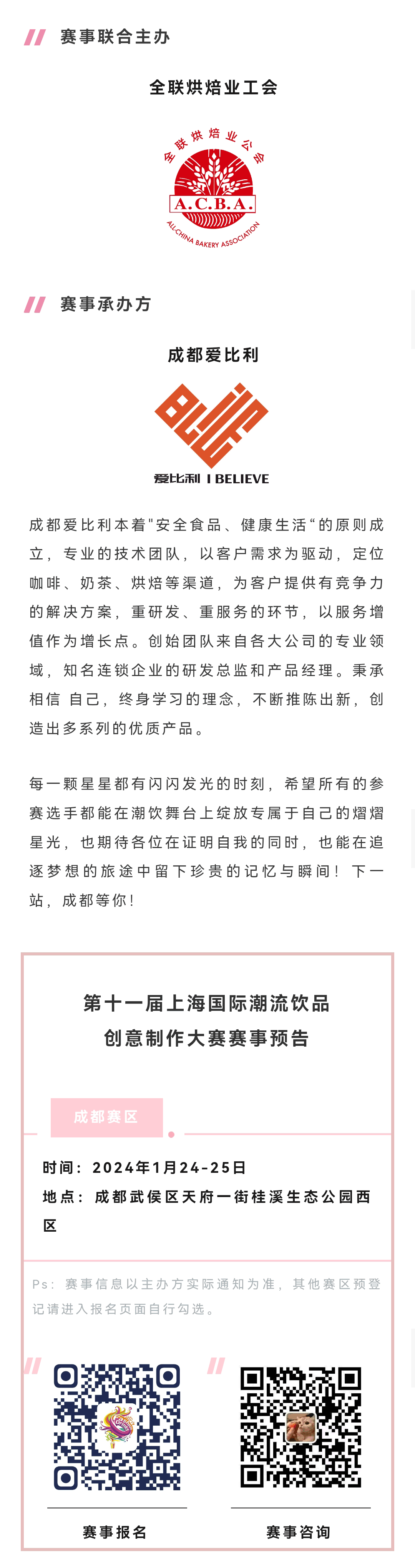 第十一屆上海國際潮流飲品創(chuàng)意制作大賽成都分區(qū)賽將于2024年1月24-25日落地成都武侯區(qū)天府一街桂溪生態(tài)公園西區(qū),選手招募火熱進行中!