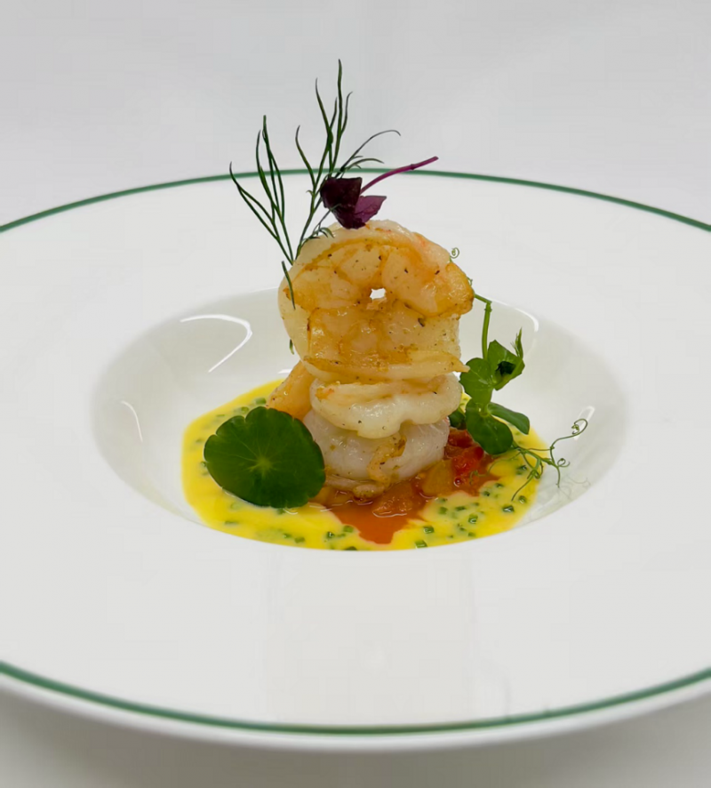 正宗法式小酒館巴黎人法式餐廳推出四道菜套餐,其中包括牛油茴香酒火焰大蝦伴藏紅花番茄甜椒汁,和香檳汁蒸鱈魚柳伴海鮮慕斯及小麥燴飯。