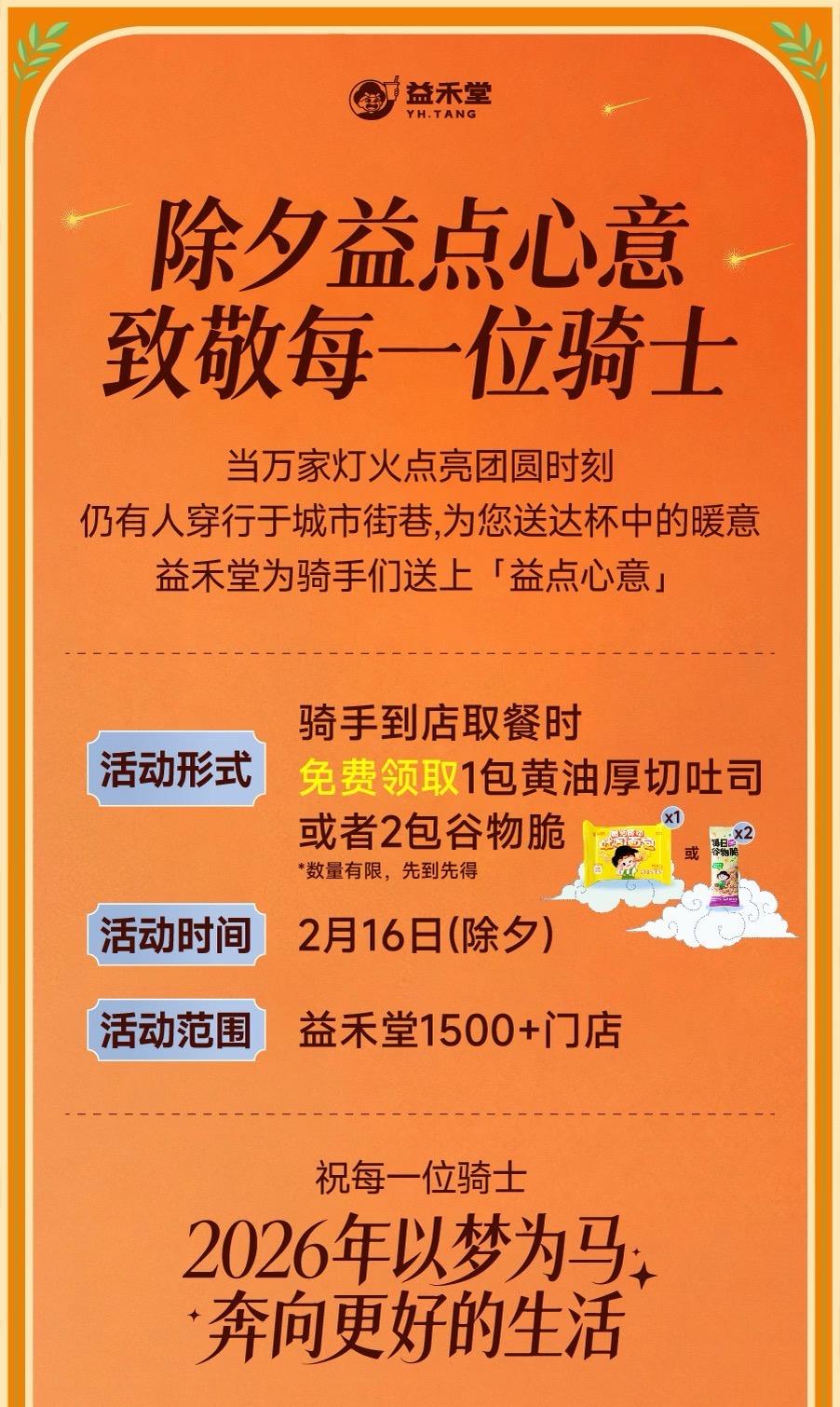 馬年除夕當天,益禾堂在全國1500余家門店同步發(fā)起「除夕益點心意」騎士關懷行動,為春節(jié)期間堅守崗位的外賣騎手,免費提供暖食補給。所有到店取餐的騎手均可免費領取1黃油厚切吐司或2份谷物脆。這份樸素的暖食,是益禾堂對城市服務者最質樸的致敬。
