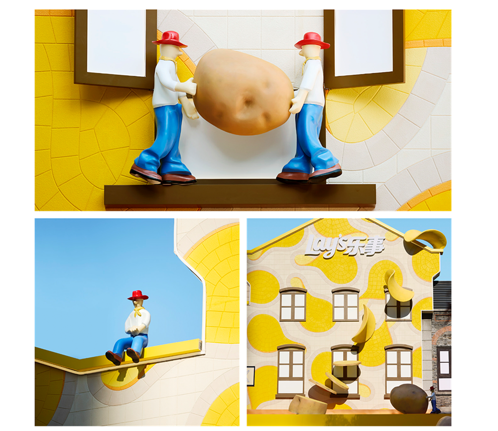 這份先鋒美學(xué)巧思,更以跨界共創(chuàng)的形態(tài)滲透進(jìn)空間各處。樂事攜手時(shí)尚設(shè)計(jì)師品牌8ON8,共同打造極具動(dòng)態(tài)張力的藝術(shù)裝置:餐廳外立面上,趣味鮮活的小人形象,生動(dòng)演繹著從土豆到薯片的奇妙轉(zhuǎn)變。他們或搬運(yùn)土豆或愜意休憩,仿佛為這場(chǎng)土豆盛宴奏響歡快序曲,自然引領(lǐng)食客開啟美味探索之旅。