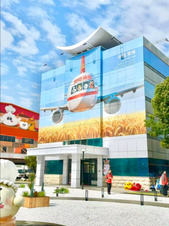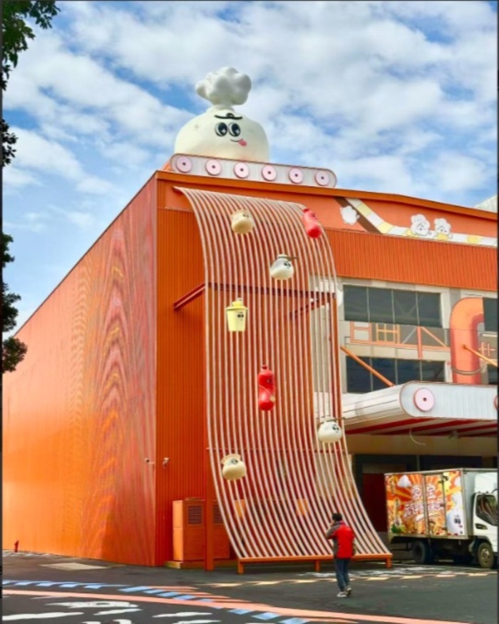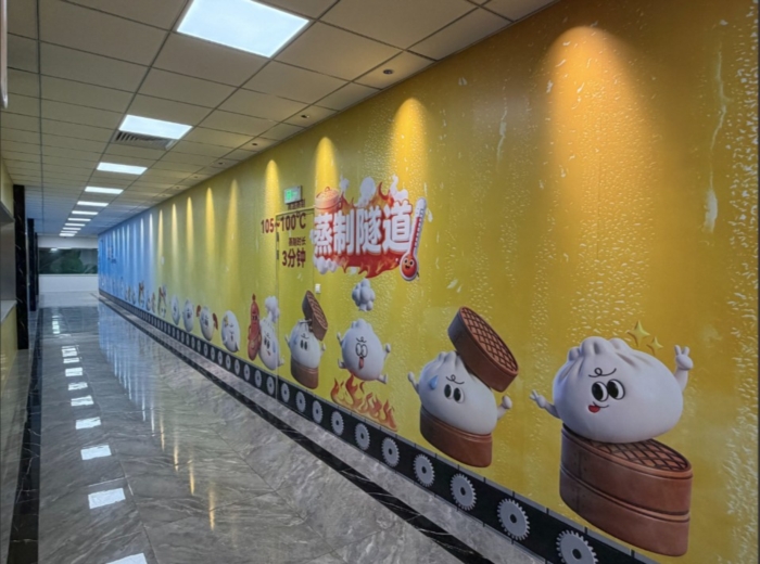 與傳統(tǒng)工廠的工業(yè)感不同,這里更像一座溫暖的“面點(diǎn)童話(huà)工廠”。明亮的橙色主調(diào)與生動(dòng)的各類(lèi)面點(diǎn)Q版形象融于各處,從屋頂矚目的“會(huì)呼吸的包子”雕塑、彰顯出海抱負(fù)的巨幅海報(bào),到可互動(dòng)擊掌的包子裝置、創(chuàng)意面點(diǎn)瀑布,遍布廠區(qū)的主題墻繪與趣味燈繪、地繪——每一處設(shè)計(jì)皆充滿(mǎn)故事感與親和力,讓生產(chǎn)空間可觸摸、可共鳴。