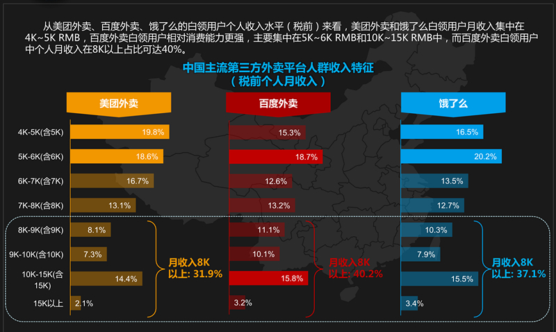 從白領(lǐng)用戶個人收入水平開看,美團(tuán)外賣和餓了么白領(lǐng)用戶主要集中在4K-5K之間,百度外賣白領(lǐng)用戶收入主要集中在5K-6K和10K到15K之間,在8K以上的用戶占比可達(dá)40%,消費(fèi)能力也更強(qiáng)。一頓20-30元左右價格的飯對于白領(lǐng)人群來說不會構(gòu)成太大問題。