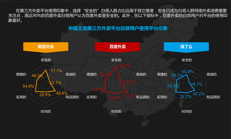 在調(diào)查中,白領(lǐng)用戶最關(guān)心的六個維度分別是高端、品質(zhì)、安全、時尚、實(shí)用、便捷,其中高達(dá)90.3%的百度外賣白領(lǐng)用戶認(rèn)為百度外賣是安全的,美團(tuán)外賣次之,餓了么則相對分?jǐn)?shù)較低。