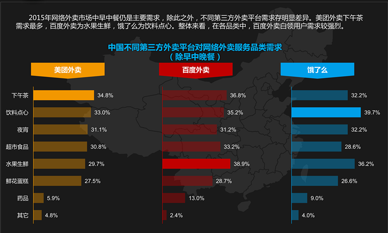 以上這張圖是除了餐飲需求外的對比,在這張圖中,美團(tuán)外賣的用戶對下午茶的需求較多,百度外賣的用戶對水果生鮮要求多,餓了么的用戶對飲料點(diǎn)心的需求較多,各有不同,百度外賣白領(lǐng)用戶的整體性需求比較強(qiáng)。