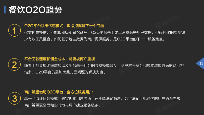 報(bào)告還稱,以優(yōu)惠和補(bǔ)貼建立的合作模式引起商家的擔(dān)憂,即以低價(jià)吸引的曝光是否能長(zhǎng)期維持,基于點(diǎn)評(píng)反饋模式的用戶溝通,也已不能滿足商戶。商戶期待更具可持續(xù)價(jià)值的合作方式,目前看來(lái),如何基于用戶的消費(fèi)數(shù)據(jù)為商戶提供服務(wù),幫助商家更全面實(shí)時(shí)地與用戶建立服務(wù)鏈條,將是O2O平臺(tái)的下一個(gè)焦點(diǎn)