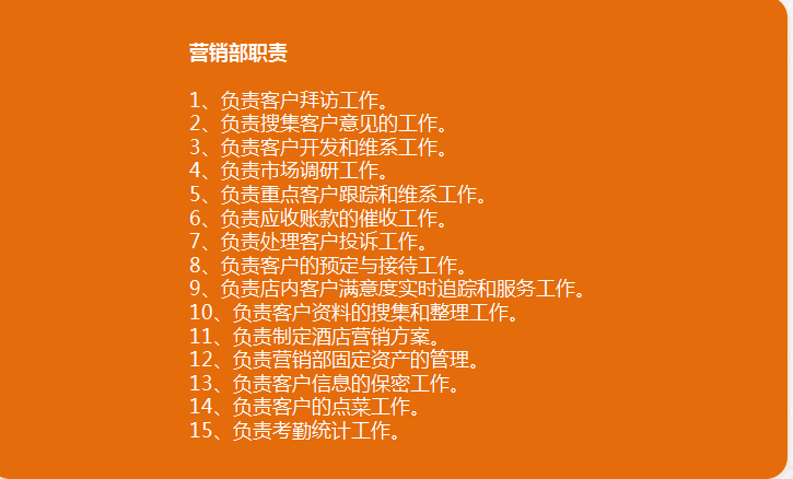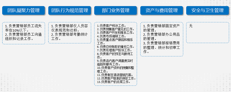 這份職責(zé)表沒有具體指定要由誰來負(fù)責(zé)哪些事情。而一份科學(xué)的部門職責(zé)必須要從多個(gè)角度來考慮,首先是團(tuán)隊(duì)建設(shè),包括凝聚力管理和行為規(guī)范管理。只有團(tuán)隊(duì)穩(wěn)定且規(guī)范,才能確保戰(zhàn)斗力。其次是與業(yè)務(wù)相關(guān)的角度,如部門業(yè)務(wù)管理、資產(chǎn)費(fèi)用管理。在這里要強(qiáng)調(diào)一句,對(duì)餐飲行業(yè)來說,食品安全與衛(wèi)生管理也是重頭戲。于是有了下面這一版本的營銷部門職責(zé)表。