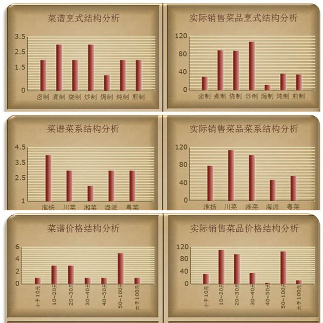 這只是一個(gè)例子。其實(shí)要選出餐廳的爆款,在現(xiàn)在這個(gè)信息化時(shí)代,完全可以借助工具進(jìn)行科學(xué)分析和評(píng)估。還是以餐廳菜譜為例,菜譜的分析有很多個(gè)維度,比如價(jià)格結(jié)構(gòu)、烹飪方式結(jié)構(gòu)、菜系結(jié)構(gòu)、味型結(jié)構(gòu)、加工難度、原材料購買難度、存貯難度、菜品毛利率結(jié)構(gòu)等等(如圖)。