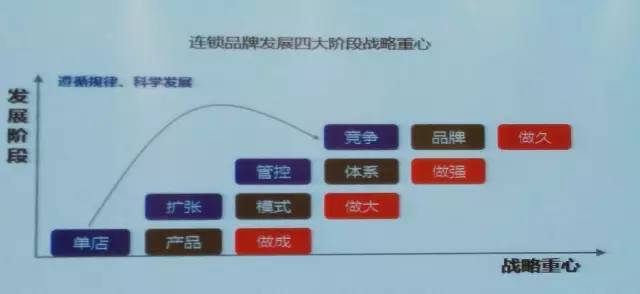 單店期,競爭核心是產(chǎn)品;擴張期,競爭核心是模式;管控期,競爭核心是體系;競爭期,競爭核心是品牌。