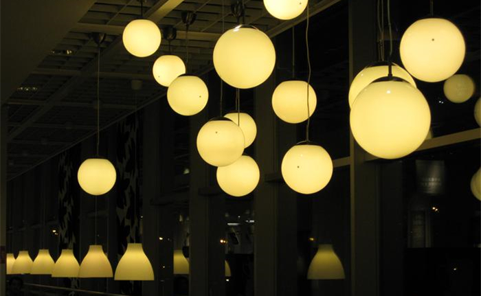 一般來說,餐廳大廳的燈光照明設(shè)計應(yīng)采用垂直式照明,亮度分布均勻,避免出現(xiàn)眩光,一般宜選用全面性照明燈具。餐廳的櫥窗和商品陳列處的亮度比一般照明要高出3~5倍,目的是強化商品的立體感、廣告效應(yīng)以吸引顧客,常使用方向性強的照明燈具,并利用色光來提高商品的藝術(shù)感染力。