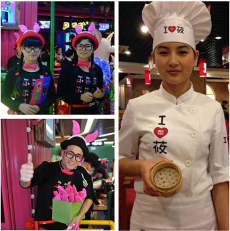 作為餐廳中閃動的元素,店員的服裝也需要自然地融入餐廳環(huán)境,與餐廳風(fēng)格保持一致,避免不和諧現(xiàn)象。比如西貝店員服飾都是統(tǒng)一的白色,首先給予人潔凈的印象,其次胸前和帽子上顯眼的logo也與餐廳整體紅色基調(diào)相映襯。再看小豬豬烤肉,店里打造的是卡通可愛、粉色萌系的風(fēng)格,因此,店員的服裝、頭飾等都密切地迎合了“粉豬”色彩,為客人提供服務(wù)時也相當(dāng)吸睛。