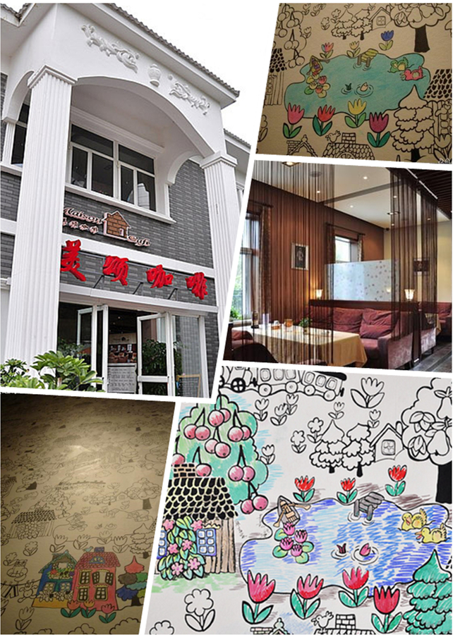 美頌的這面“涂鴉墻”并非完全空白,墻上本身是有許多不帶色彩只有輪廓的兒童畫作。店家會為客人提供彩色筆,讓感興趣的客人能夠帶著小孩子一起在墻上填涂色彩。這種形式是不是有些眼熟呢?其實這算得上是擴大版的“秘密花園”。無論小孩或是大人們,都可以無拘無束地投入到天馬行空的想象和創(chuàng)作當中,為大小客人帶來輕松愉悅的氛圍。
