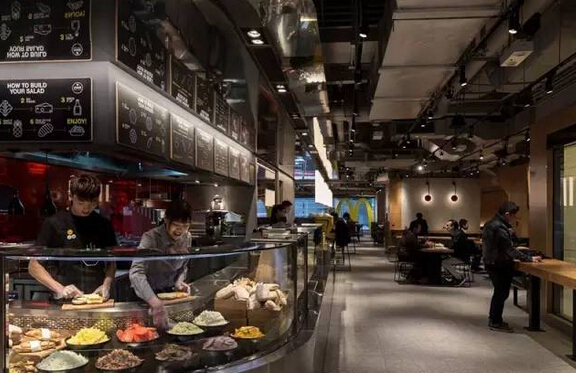 采用了大量開放、通透的設計,風格簡約之余,更提高了食物制作過程的透明度;增添了19種食材的自選沙拉,可自由搭配包括芝士、醬汁、配菜等;店內還有送餐服務、高質量的自助點餐機,從冰冷到溫馨,從快餐店變?yōu)樾蓍e餐廳,增加了開放性和互動性。