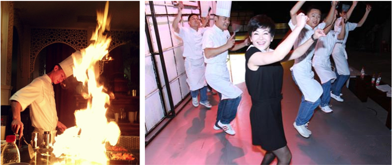 餐廳若是選擇廚藝表演這一項需要經(jīng)過慎重的考慮,一來要考慮菜品的操作程序,制作過程繁復(fù)的菜品不適宜用于表演,顧客不會有太長的耐心盯著廚師始終搗騰一道菜;二來要考慮表演的觀賞性,表演需要有震撼點,像鐵板燒制作過程中的火焰就不是顧客能常見的表演,實在沒有較高觀賞性的話,不妨增強(qiáng)表演的互動度,總之表演一定要能吸引住顧客的眼球。