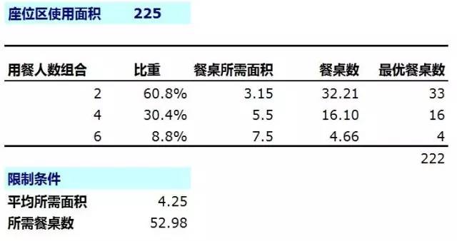 同樣還是這家餐廳,座位區(qū)可使用面積225平,每個類型餐桌所需面積如下。計算方法與剛剛類似,只不過將平均用餐人數(shù)換成平均所需面積,在此基礎(chǔ)上得出所需餐桌數(shù)。同樣的,再按照用餐人數(shù)組合的比重分配,即可得出最優(yōu)餐桌數(shù)組合。