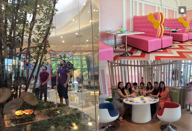 從餐廳大門進來,一眼就能看到趣味可愛的鳥籠餐區(qū)。置身于木質(zhì)的巨大鳥籠,被各類綠色植物包圍其中,仿佛穿越到了巨大的國度,讓人大呼過癮。而在餐廳入口的右方,則是夢幻十足的Hello Kitty餐區(qū)。餐區(qū)以粉色為主色調(diào),充滿幻想的設(shè)計,讓孩子們一秒變公主。