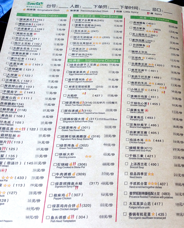 在綠茶的菜單上,你會(huì)發(fā)現(xiàn)部分菜品名的后面標(biāo)有紅色的大拇指、星星、辣椒等顯眼的標(biāo)記。其中,辣椒代表著菜品的辣度,大拇指代表綠茶餐廳的招牌菜,星星則代表餐廳推薦菜,星星越多也就代表這道菜在顧客當(dāng)中的受歡迎程度越高。