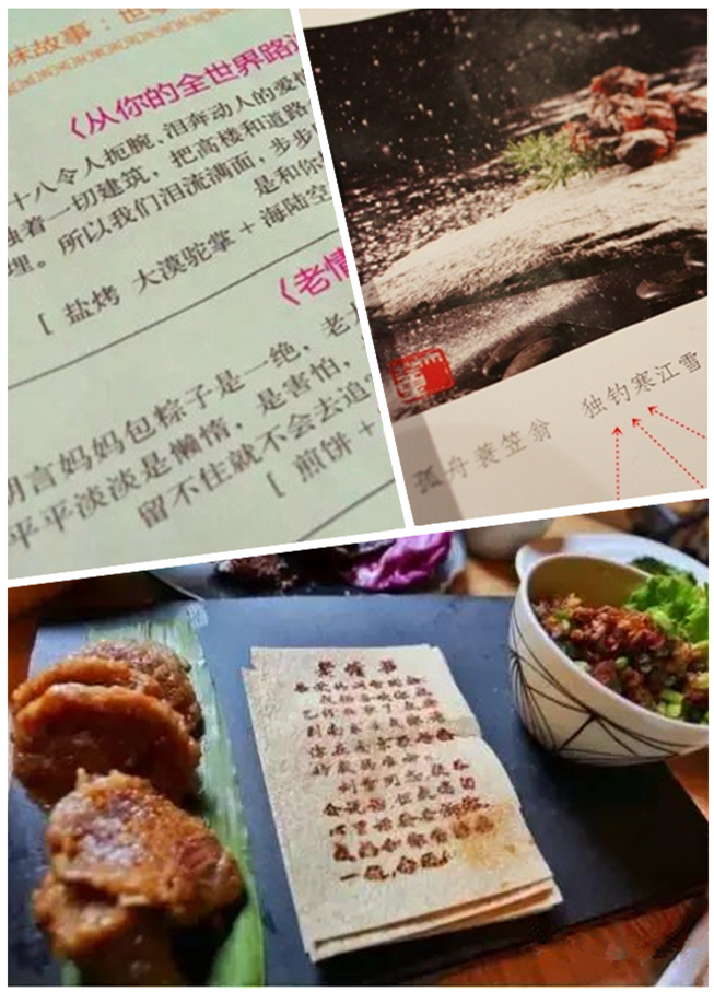 此外,那些熱門小說家開的“小說餐廳”,像張嘉佳的“從你的全世界路過”、韓寒的“很高興遇見你”等等,菜單上的菜品名都是與小說情節(jié)有關(guān)的詞句,但從詞句上很難看出這道菜的“真面目”。這樣會(huì)講故事的菜單,讓人們在閱讀菜單時(shí)有了濃重的代入感和好奇心,也因此對菜品更加印象深刻。