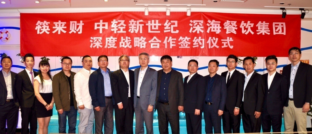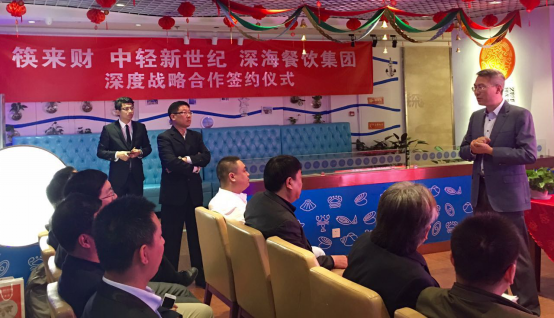 筷來財聯(lián)合創(chuàng)始人兼CEO李宏文,中輕新世紀總經(jīng)理助理崔長春以及深海餐飲集團董事長孫志剛等三方主要領(lǐng)導(dǎo)出席當天的簽約儀式。