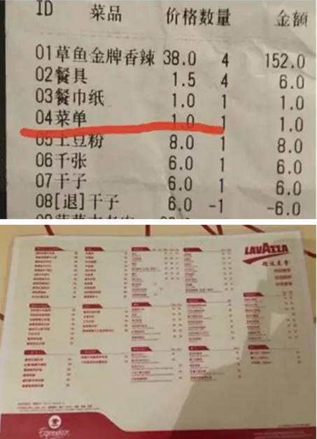 日前,有市民在鎮(zhèn)江市某家烤魚(yú)店就餐時(shí)遭遇堵心事。原本開(kāi)心的飯局,但結(jié)賬時(shí)看到賬單上的一項(xiàng)名目赫然寫(xiě)著“菜單”二字,收費(fèi)一元。這讓人訝異不已,以前只知道有些餐廳收取消毒費(fèi)、蘸料費(fèi)等,但長(zhǎng)這么大還是頭回聽(tīng)說(shuō)菜單也收費(fèi)!更有網(wǎng)友吐槽“以后餐館的桌椅是不是也會(huì)加入收費(fèi)行列了?”
