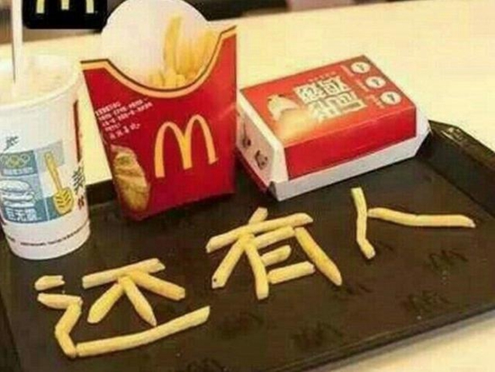當(dāng)你獨(dú)自一人外出用餐,上餐后又恰巧想上廁所,但是一離開(kāi)座位,桌上的食物就可能會(huì)被當(dāng)做吃剩的處理掉,那該如何解決呢?近日,有網(wǎng)友貼出了自己的親身經(jīng)歷:在麥當(dāng)勞就餐時(shí)想離開(kāi)去廁所,為防止食物被收,他用薯?xiàng)l在餐盤(pán)中擺出來(lái)“還有人”三個(gè)字。工作人員看到后也笑稱(chēng)“方法挺實(shí)用”。