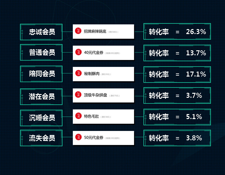 比如針對(duì)忠誠會(huì)員,營(yíng)銷目的是提高客單價(jià),則可根據(jù)忠誠會(huì)員的口味投其所好,贈(zèng)送其喜歡的口味菜品,通過提高菜品優(yōu)惠券的使用標(biāo)準(zhǔn)來提高客單價(jià)。