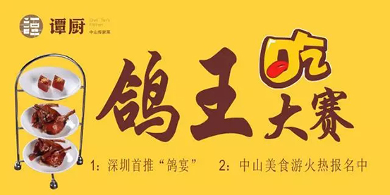 最后,需要提醒各位的是,中山美食游與鴿王大賽初賽的報名都已經(jīng)在火爆進行中。想要參加中山美食游的顧客可以選擇在各個譚廚分店的收銀臺處進行報名;而意欲免費參加鴿王大賽的顧客請注意以下報名時間與方式。