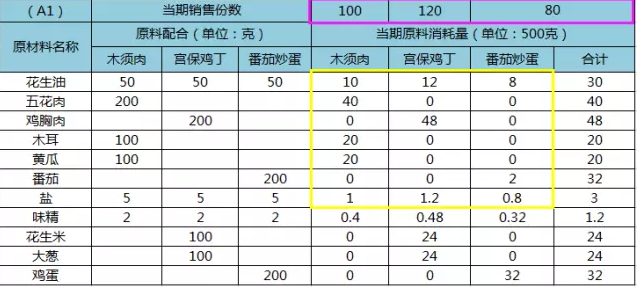 這是一家餐廳菜品統(tǒng)計(jì)表模型,紅色框內(nèi)為3份菜品當(dāng)期銷(xiāo)售份數(shù),黃色框內(nèi)為當(dāng)前份數(shù)下該菜品原料消耗的理論值:銷(xiāo)售份數(shù)*配方原料量/500(克與斤的轉(zhuǎn)換系數(shù)),如100份木須肉中花生油理論消耗量為100*50/500,最終數(shù)據(jù)為10斤,從表格中可以看出這三份菜品總共消耗的花生油理論值為30斤。