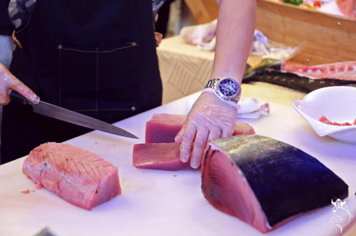 開魚秀的主角大目金槍魚,更是從太平洋遠(yuǎn)道而來。大目金槍魚生活在水深100-400米的大洋深處,是金槍魚中的一個類別,與藍(lán)鰭金槍魚相似。嘗過大目金槍魚的都知道,其肉質(zhì)綿柔,口感更為軟嫩,是各大海鮮日料館選用最多的一種金槍魚。身為堂食刺身與外賣刺身專家更是必不可少了。開魚秀是由擁有豐富經(jīng)驗(yàn)的大廚主持,看他熟練精準(zhǔn)的開魚刀法,也是一場盛大的視覺享受。