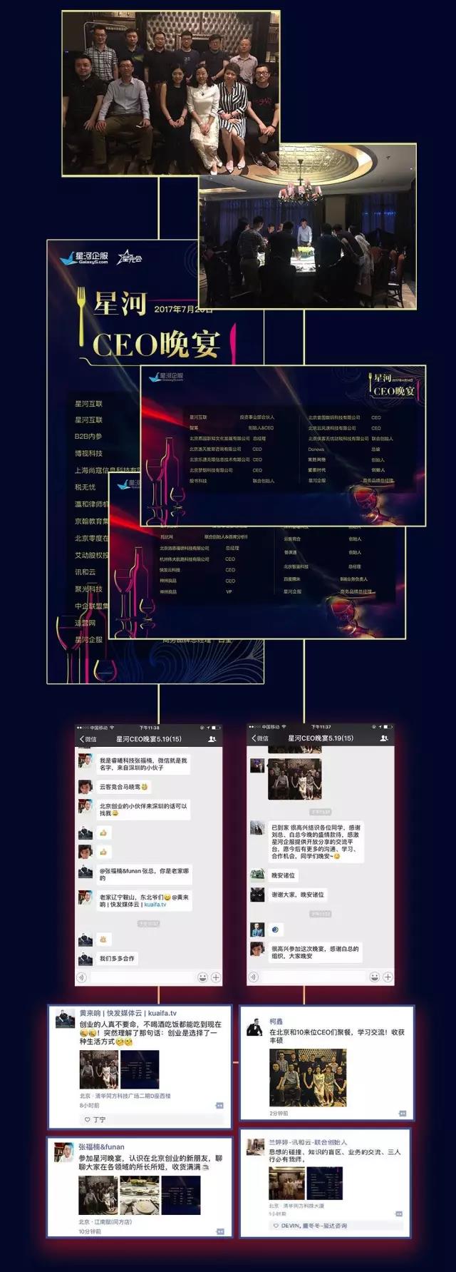 由此我們策劃“認(rèn)識(shí)更多CEO、互助更多CEO”的星河CEO晚宴,讓您在輕松的晚宴中結(jié)識(shí)跨界牛人,跨領(lǐng)域社交、學(xué)習(xí)、人脈拓展,甚至融資的事情都可能在這一頓飯的時(shí)間里解決了。