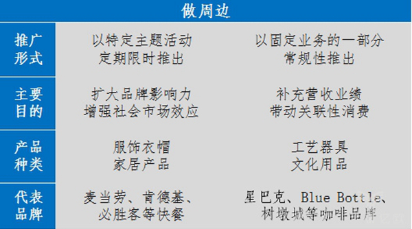 不過,由于國內(nèi)餐飲品牌的經(jīng)營思路仍較為單一、傳統(tǒng),因此“周邊”的概念仍主要在國外的餐飲品牌上得到充足表現(xiàn)。從他們的業(yè)務(wù)來看,大致分為兩種“周邊”的發(fā)展模式。