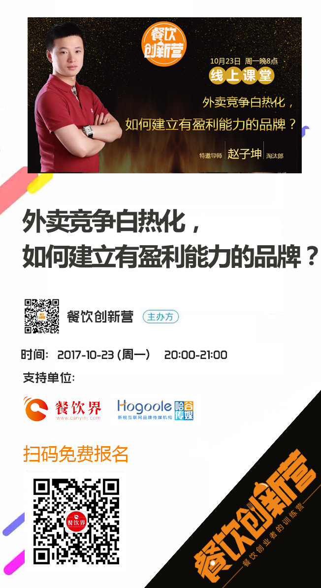一個(gè)人的時(shí)候,想吃火鍋怎么辦? 一家火鍋店在全國(guó)各地該如何運(yùn)營(yíng)? 專注外賣行業(yè)創(chuàng)業(yè)是否可行? 沒(méi)有市場(chǎng)預(yù)算又如何成功做好外賣? 10月23日晚八點(diǎn), 餐飲界新媒體聯(lián)合餐飲創(chuàng)新?tīng)I(yíng)特邀淘汰郎火鍋創(chuàng)始人兼CEO趙子坤 跟大家聊聊外賣競(jìng)爭(zhēng)白熱化,如何建立有盈利能力的品牌?