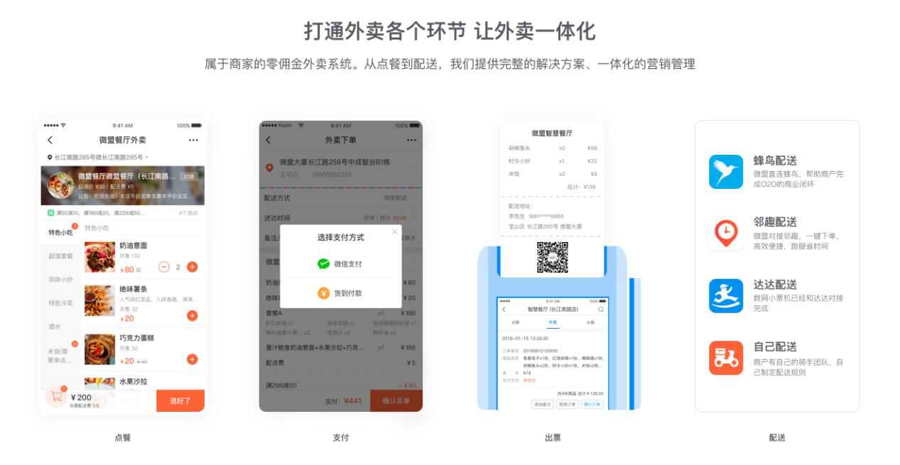 據(jù)悉,微盟智慧外賣是微盟旗下全新的外賣解決方案,可為商戶提供包含外賣、支付、配送、會(huì)員管理系統(tǒng)等在內(nèi)的多種服務(wù),支持線上下單、線下物流配送,幫助商戶擺脫第三方平臺(tái)的捆綁,提高外賣效率。