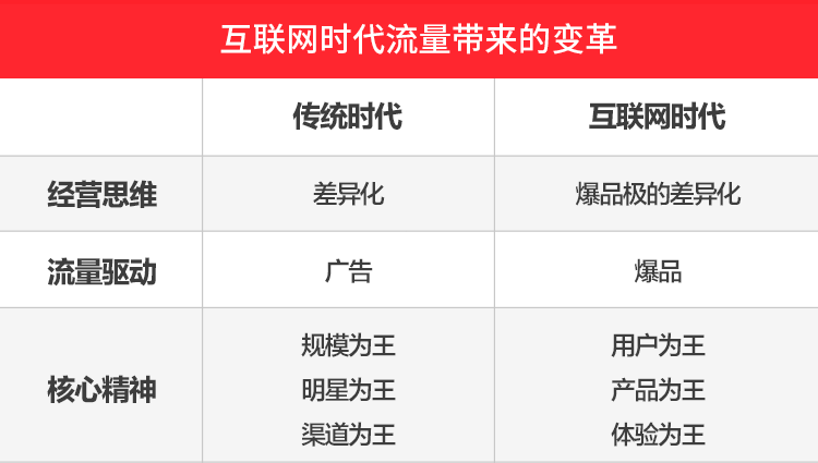 在他眼中,這場(chǎng)革命最大的不同是流量,也就是餐飲人的生意模式要發(fā)生改變。在過(guò)去,驅(qū)動(dòng)流量的核心是廣告,而現(xiàn)在卻是爆品。過(guò)去大家常說(shuō)要做差異化,但是目前看來(lái),只靠差異化遠(yuǎn)遠(yuǎn)不夠,必須做爆品級(jí)的差異化。