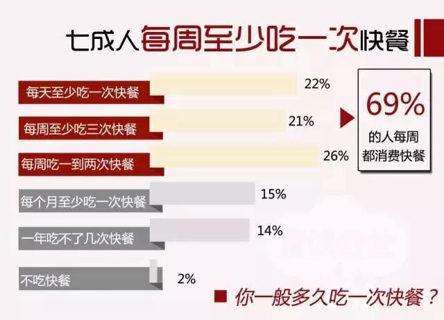 在我們的調(diào)查中,有22%的人表示他們每天至少吃一頓快餐,而每周吃三次快餐和每周吃一到兩頓快餐的人分別占21%和26%。也就是說(shuō),69%的人每周至少會(huì)吃一次快餐。