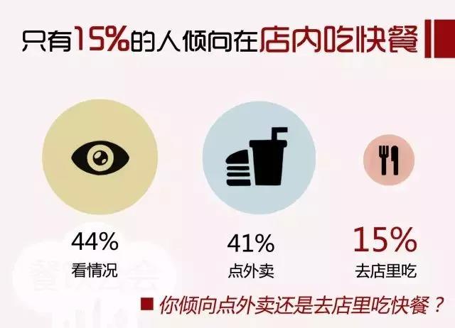 在所有餐飲業(yè)態(tài)中,快餐一定是被各大外賣(mài)平臺(tái)改造最為徹底的一個(gè)。在調(diào)查中,只有15%的人明確表示自己會(huì)去店里吃一頓快餐。只愿意點(diǎn)外賣(mài)的用戶占41%,剩下的44%的人會(huì)看情況決定是否要去店內(nèi)吃還是叫外賣(mài)。 外賣(mài)對(duì)于快餐行業(yè)的影響不言而喻,經(jīng)營(yíng)得當(dāng)?shù)目觳皖?lèi)商家,外賣(mài)流水可以占到50%甚至更高。外賣(mài)具備的打破空間限制的特性,也一定程度上弱化了商圈和店址對(duì)于快餐商家的重要性。