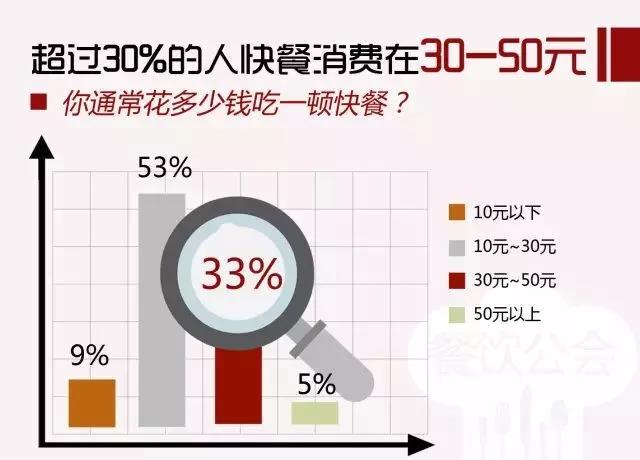 值得注意的是,33%的人表示他們的快餐消費(fèi)在30-50元,這個(gè)數(shù)據(jù)接近整個(gè)餐飲業(yè)的人均消費(fèi)。在消費(fèi)升級(jí)的趨勢(shì)下,快餐和正餐的界限正在消失。